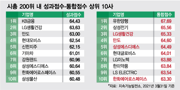시총 1위인 삼성전자도 60위, 2위인 SK하이닉스는 30위에 그쳤다. NAVER는 68위, 삼성SDI는 56위, 기아는 52위였다. 그린뉴딜로 지난해 증시의 주역이었던 2차전지, 인터넷, 수소차 관련 기업들이 모두 ESG 측면에서는 높지 않은 점수를 받은 셈이다.