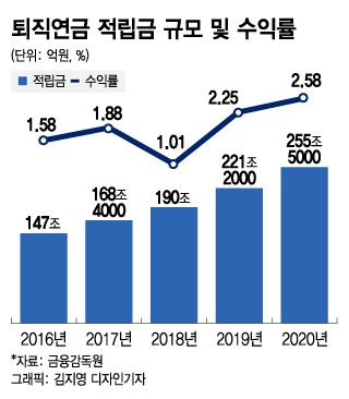 직장인들의 노후자금인 퇴직연금 규모는 지난해 255조원을 넘어섰다. 올해는 290조원을 웃돌 것으로 추정된다. 퇴직연금의 몸집은 해마다 불어나고 있지만 연간 수익률은 1~2%대에 불과하다. 노후소득을 보장하기엔 턱없이 부족한 수익률이다.
