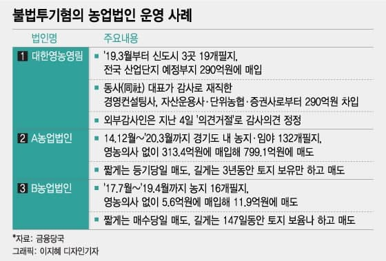 최근 언론보도를 통해 부동산투기 사실이 드러난 농업법인 대한영농영림은 자본금 6억원으로 약 290억원을 차입해 지난 2019년 3월부터 신도시 3곳 19개 필지와 경기도 파주·평택, 울산·대구 등 산업단지 예정부지를 매입한 것으로 나타났다.