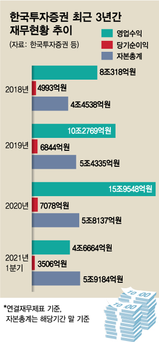 2019년 말 기준으로 자기자본 5조4300억원에 그 해 10조2800억원의 영업수익을 기록했던 한국투자증권은 지난해 자기자본 5조8100억원에 영업수익 15조9500억원을 달성했다. 올 1분기에도 한국투자증권은 4조6664억원의 영업수익에 당기순이익 3506억원을 기록하며 순이익 기준 역대 최대 분기 실적을 달성했다.