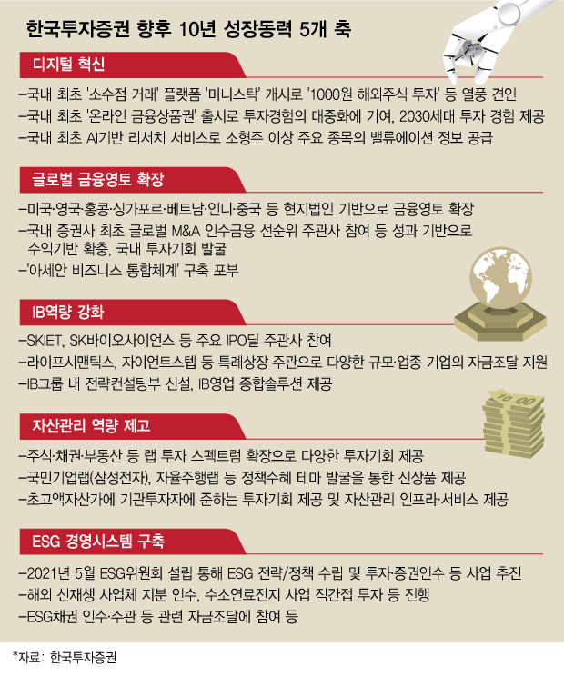 부동산·미술품 등 고액 자산을 소액으로 쪼개 매매할 수 있도록 한 '소수점 투자' 플랫폼도 한국투자증권이 디지털 역량을 강화함으로써 가능해졌다는 평가다. 금융권과 ICT(정보통신기술) 업체들을 중심으로 하는 소수점 투자의 시초는 한국투자증권의 '미니스탁'이다. '1000원으로 시작하는 해외주식 투자' 등 한국투자증권의 슬로건은 2030세대를 투자 영역으로 이끄는 데 효과를 일으켰고 투자의 지평도 국내를 벗어나 미국·유럽·일본·중국 등 해외 주요시장으로까지 넓어졌다.