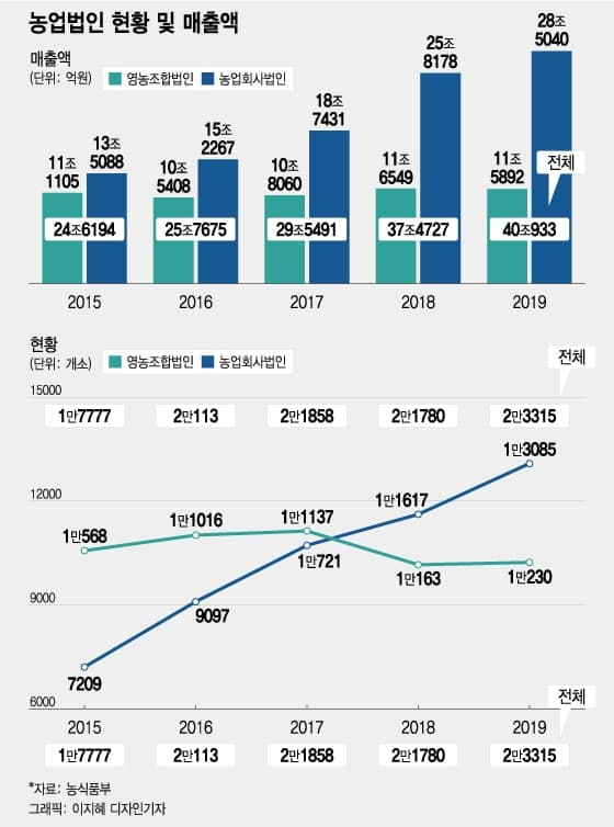 지난 2월 농식품부가 밝힌 '2019년 기준 농업법인 통계조사'에 따르면 실질운영 중인 활동 법인은 총 2만3315개소로 나타났다. 영농목적으로 설립이 가능한 농업회사법인은 농업인 1명 이상이 주주로 참여하고 농업인 출자액이 전체의 10% 이상이어야 한다.