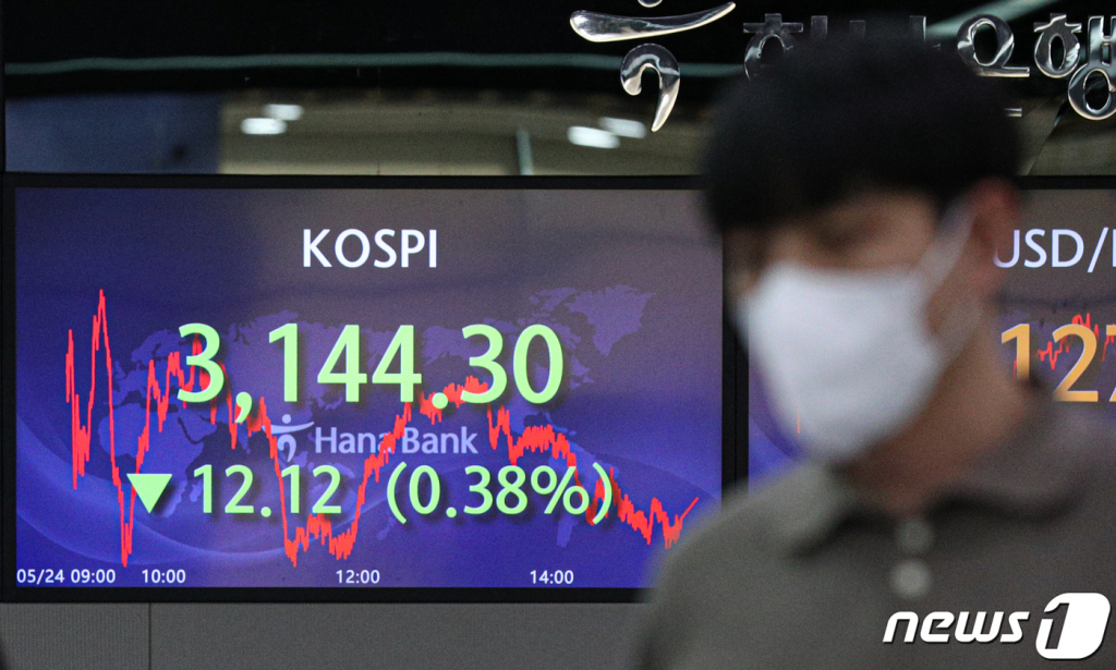 24일 코스피는 전거래일 대비 12.12포인트(0.38%) 내린 3144.30에 장을 마쳤다. 개인과 기관이 각각 1767억원, 506억원 순매수했지만 외국인이 2350억원 순매도하며 지수를 끌어내렸다.