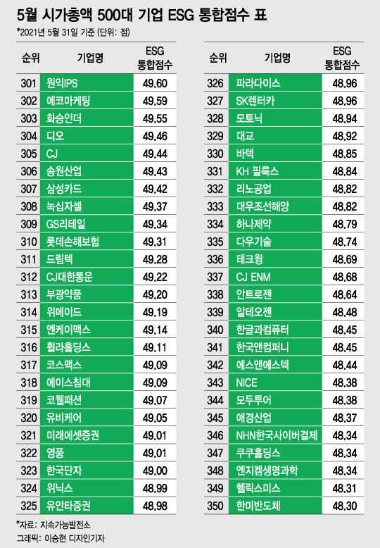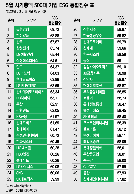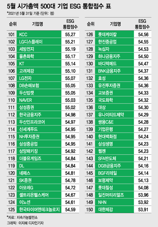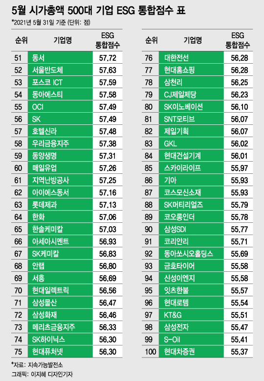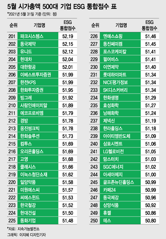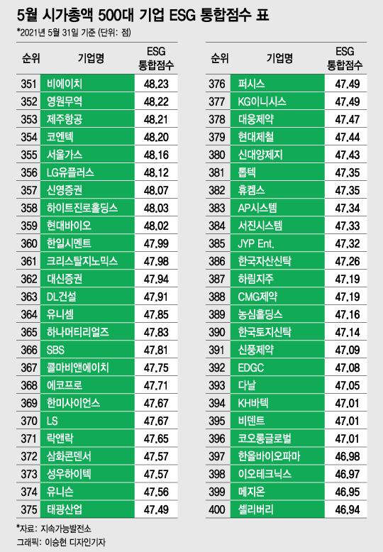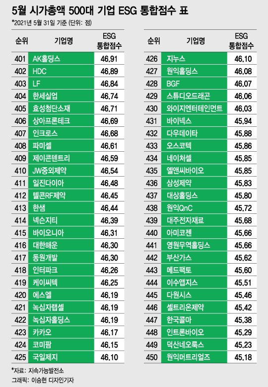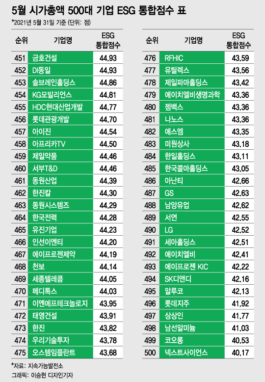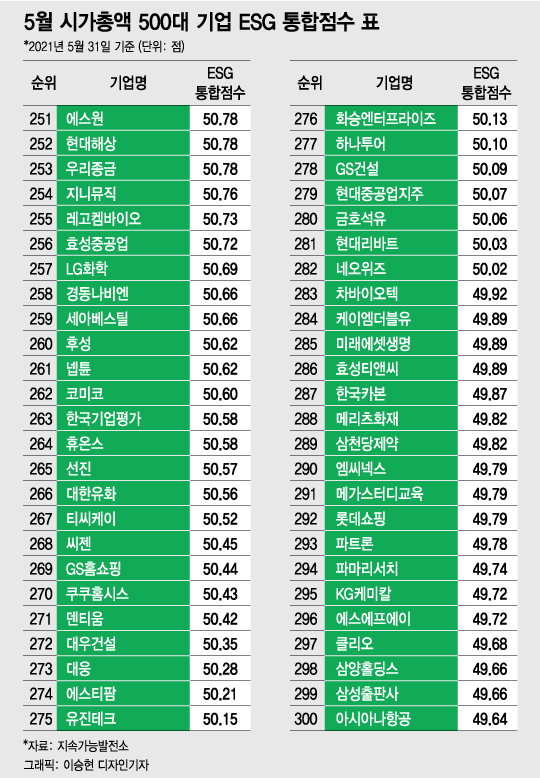 [대한민국 상장사 ESG 리스크 대해부③] [편집자주] 머니투데이와 지속가능발전소는 매월말 기준 국내 시가총액 상위 500대 기업의 ESG(환경·사회·지배구조) 통합점수를 공개한다. 아래는 올 5월31일 기준 시가총액 상위 500대 기업의 ESG통합점수 내역을 정리한 표다. 독자들의 PICK! 윤미래, 뒤늦게 알려진 사망 소식..."긴 여행 떠나" 동서와 갈등→파혼 2번 아내..."조카는 남편 아이" 의심 충격 추성훈, '파격' 누드 화보 공개…"돈 안 받아, ♥야노 시호도 촬영" "남성 의사가 은밀한 곳 봤잖아" 이혼 선언…산부인과서 난동