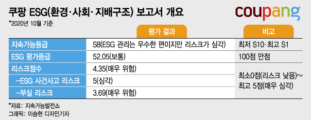 쿠팡의 ESG리스크는 E(환경) S(사회) G(지배구조) 모든 요소가 높게 나타났다. E 리스크가 3.69점(매우 높음), G 리스크가 4.43점(심각)이었고 S 리스크는 5점 만점에 5점으로 최고치에 달하는 것으로 평가됐다.