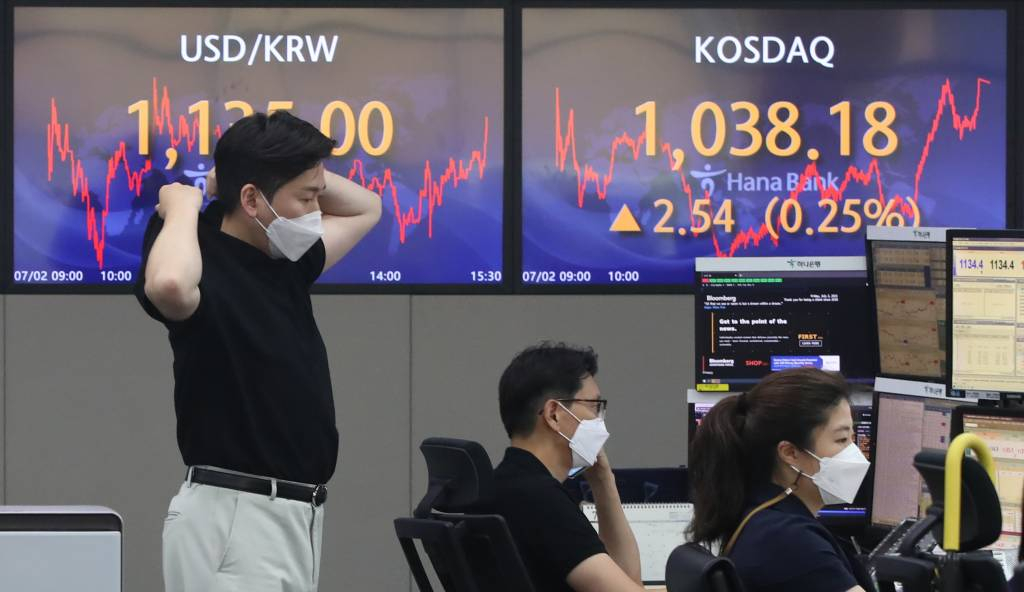 ![[서울=뉴시스]조수정 기자 = 코스닥이 전 거래일(1035.64)보다 2.54포인트(0.25%) 오른 1038.18에 장 마감하며 이틀째 연고점을 경신한 2일 오후 서울 중구 하나은행 딜링룸에서 전광판에 지수가 표시돼 있다. 이날 코스피는 전 거래일(3282.06)보다 0.28포인트(0.01%) 내린 3281.78에, 서울 외환시장에서 원·달러 환율은 전 거래일(1133.1원)보다 1.9원 오른 1135.0원에 거래를 마쳤다. 2021.07.02. chocrystal@newsis.com](https://thumb.mt.co.kr/cdn-cgi/image/f=avif/21/2021/07/2021070217013836928_1.jpg)