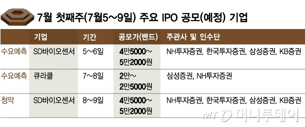 이번주(5~9일) IPO 시장에서는 체외진단 업체 SD바이오센서와 혈관질환 신약개발사가 수요예측에 나선다. SD바이오센서는 5~6일, 큐라클은 7~8일이다. SD바이오센서는 8~9일 청약도 진행할 예정이다.