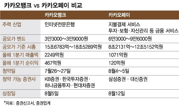 카카오그룹의 대표 금융기업인 카카오뱅크와 카카오페이가 IPO(기업공개)를 위한 출사표를 던졌다. 상장 예정일은 오는 8월 5일(카카오뱅크)과 12일(카카오페이)로 불과 일주일 차이다.