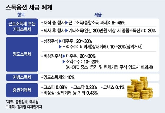 스톡옵션 행사 시 적용되는 세금의 종류는 4가지다. △근로소득세(또는 기타소득세) △양도소득세(주식 양도 시) △지방소득세 △증권거래세 등이다. 근로소득세의 경우 재직 중 스톡옵션을 행사한다면 '근로소득', 퇴사 후 행사하면 '기타소득'으로 과세가 된다.