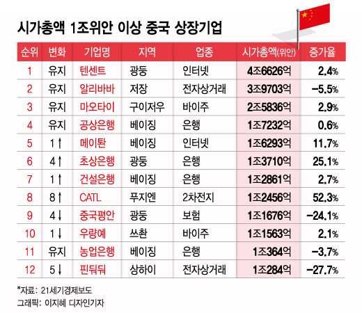 그 다음은 인터넷 기업이다. 텐센트와 알리바바의 시가총액이 각각 4조6626억 위안(약 816조원)과 3조9703억 위안(약 695조원)으로 1, 2위를 차지했다. 5위는 배달앱인 메이퇀(1조6293억 위안, 약 285조원), 12위는 전자상거래업체인 핀둬둬(1조284억 위안, 약 180조원)다. 중국 시가총액 1조위안 이상 클럽에서는 꼴찌인 핀둬둬의 시가총액도 코스피 시총 2위인 SK하이닉스(약 90조원)의 두 배에 달할 정도로 규모가 크다.