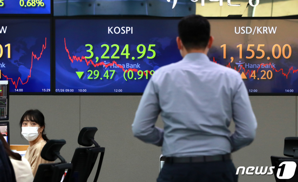 26일 코스피 지수는 전거래일 대비 29.47포인트(0.91%) 내린 3224.95포인트로 장을 마감했다. 이날 코스피는 전거래일대비 0.36% 상승 출발했지만 10여분 후 바로 하락전환했다. 개인이 7204억원 순매수했지만 외국인과 기관이 각각 3751억원, 3372억원 순매도했다.