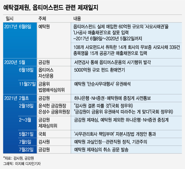 금융감독원이 '옵티머스 펀드 사태' 와 관련 사무관리사인 한국예탁결제원에 대한 중징계 방침을 철회키로 최종 결정을 내렸다. 감사원 징계로 제재 효과를 누렸다는 이유지만 옵티머스 펀드 판매사인 NH투자증권, 수탁사인 하나은행은 중징계 조치를 받은 바 있어 형평성 논란도 제기된다.