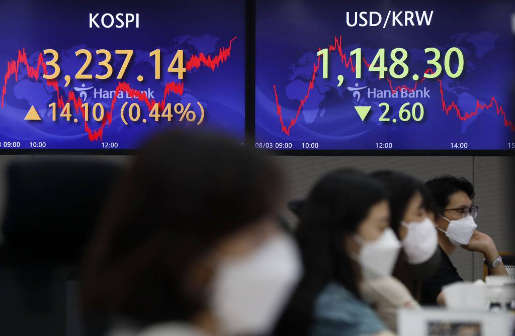 ![[서울=뉴시스]홍효식 기자 = 코스피가 전 거래일(3223.04)보다 14.10포인트(0.44%) 오른 3237.14에 마감한 3일 오후 서울 중구 하나은행 딜링룸 전광판에 지수가 표시되고 있다. 이날 코스닥 지수는 전 거래일(1037.80)보다 1.69포인트(0.16%) 내린 1036.11, 원·달러 환율은 전 거래일(1150.9원)보다 2.6원 내린 1148.3원에 마감했다. 2021.08.03. yesphoto@newsis.com](https://thumb.mt.co.kr/cdn-cgi/image/f=avif/21/2021/08/2021080316282074382_1.jpg)