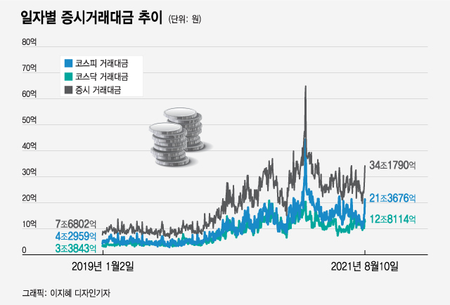 코스피를 1400대에서 올해 3300대까지 끌어올린 데도 낮은 금리에 힘입은 '빚투'의 역할이 컸다. 저금리 기조가 이어지며 코로나 사태 전인 2019년 9조3000억원이었던 일평균 거래대금(코스피·코스닥 합산)은 지난해 23조원을 넘어섰고 올해 들어 현재까지도 벌써 29조원을 웃돈다.