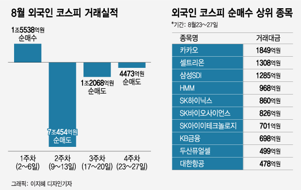 8월 외국인 투자자의 강한 순매도세 속 순매수한 기업에 투자자 관심이 모인다. 외국인 비중이 큰 국내 증시에선 외국인 순매수 기업의 주가가 양호한 흐름을 보이는 경향이 있기 때문이다.