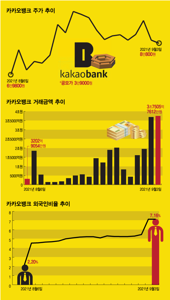 끝이 아니었다. 상승세는 꾸준히 이어졌다. 상장 2주만인 지난달 19일 종가 기준 9만2000원으로 최고가를 기록했다. 이후 부침이 있었지만 지난 3일 종가 8만800원으로 상장 첫날 대비 15.76% 더 높은 가격대를 유지하고 있다. 지난 1일 대규모 블록딜로 주가가 충격을 받은걸 감안하면 카카오뱅크에 대한 시장의 긍정적 평가가 이어지고 있는 셈이다.