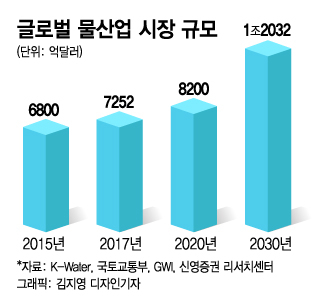 7일 신영증권과 K-Water에 따르면 글로벌 물산업 시장 규모는 2017년 기준 약 7252억달러 수준이다. 2020년까지 연평균 4.0% 이상 성장하고 2030년에는 1조2032억달러까지 성장할 것으로 전망된다.