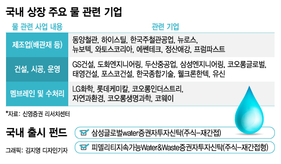 오광영 신영증권 연구원은 "물산업은 과거 사회간접자본 및 공공성 측면이 강조됐으나 현재는 물 관련 산업의 발전과 물이 경제재란 인식의 전환이 이뤄짐에 따라 핵심 산업의 하나로서 점차 주목받고 있다"며 "점점 중요해져가는 물산업에 대한 투자를 자산 바구니에 담을 것을 권한다"고 말했다.