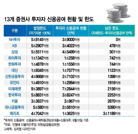 삼성증권은 4조5499억원, KB증권은 3조4022억원의 신용 공여를 제공했다. 두 증권사 모두 자체 한도 설정액의 98%를 이미 다 제공한 상태다.