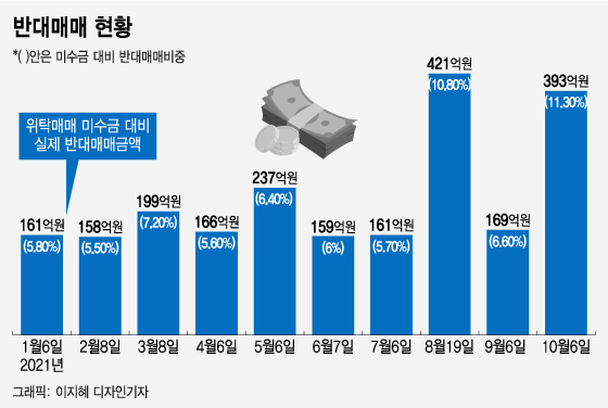 8일 금융투자협회에 따르면 지난 6일 기준 위탁매매 미수금 대비 반대매매금액은 393억원으로 나타났다. 이는 지난 2011년 이후의 일일 반대매매 금액 가운데 지난 8월 19일 421억원에 이어 두 번째로 큰 규모다.