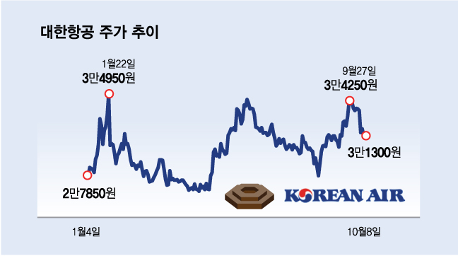 9월부터의 주가 상승을 이끈 주체는 기관이었다. 기관은 9월 이후 최근까지 대한항공을 1732억원어치 사들였다. 코스피 내 기관이 많이 사들인 종목 3위를 기록했다. 다만 이달 들어 약세로 돌아서며 커지며 현재(8일 기준) 주가는 3만1300원이다.