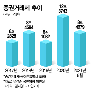 13일 유경준 국민의힘 의원실이 국세청으로부터 받은 자료에 따르면 올 6월까지 8조 4979억원의 증권거래세(농어촌특별세 포함)가 걷혔다. 올 상반기만 지난해 역대 최대 금액(12조 3743억원)의 약 70%가 걷힌 셈이다. 또 올 8월까지 증권거래세는 전년대비 2조2000억원, 농특세는 2조3000억원 등이 더 걷혔다.