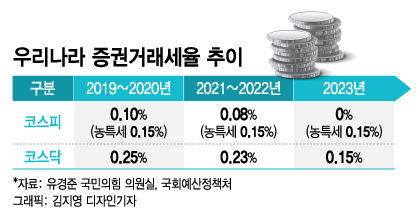 정부가 단계적으로 증권거래세를 인하하고 있지만 거래대금이 늘면서 세금은 더 많이 쌓였다. 정부는 2023년부터 모든 상장 주식에 대해 연간 5000만원이 넘는 양도차익에 대한 양도소득세를 부과하는 대신 같은해부터 코스피 증권거래세율을 0%로 맞췄다. 단 매도시 부과되는 농어촌특별세 0.15%는 유지된다. 농어촌특별세가 부과되지 않는 코스닥 거래세율도 0.15%로 인하한다.