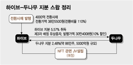 하이브는 두나무 지분 2.48%를 5000억원에 취득하고, 두나무는 하이브의 제 3자 배정 유상증자에 참여해 하이브 지분 5.57%를 7000억원에 취득했다. 또 하이브는 전환사채(CB) 4000억원을 발행했다.
