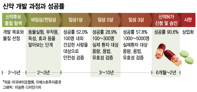 미국바이오협회가 2011년부터 지난해까지 임상을 분석한 바에 따르면 임상 1상 착수 후 품목허가를 받기까지 성공률은 평균 7.9%에 불과하다. 개발기간은 평균 10.5년이다.