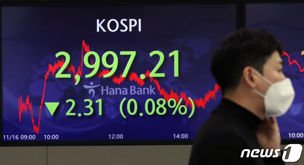 코스피는 전날보다 2.31포인트(0.08%) 내린 2997.21로 거래를 마쳤다. 장중 한때 3011.88까지 올랐지만 오후 들어 상승분을 반납하면서 하락 전환했다.