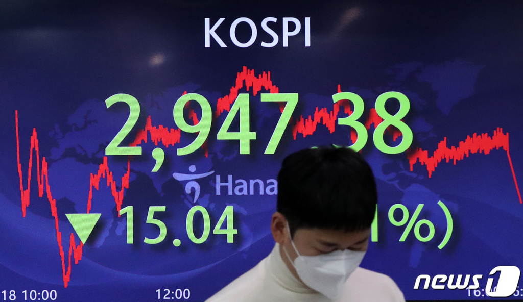 코스피는 전날보다 15.04포인트(0.51%) 내린 2947.38로 마감했다. 이날 2937.53까지 하락했던 코스피는 오후 들어 잠시 상승 전환했지만 결국 2950선을 내줬다. 지난 16일 이후 사흘 연속 하락이다.