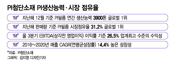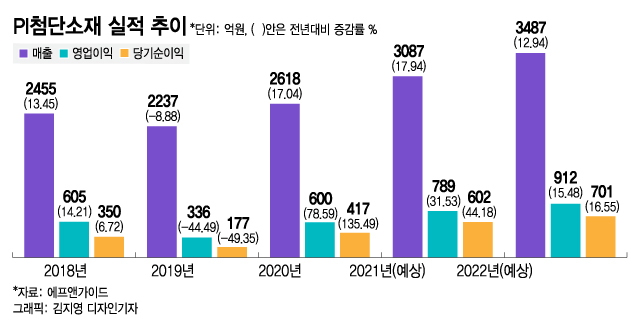 PI첨단소재 실적 전망치도 높다. 금융정보업체 에프앤가이드에 따르면 PI첨단소재 올해 매출액은 전년대비 17.94% 증가한 3087억원으로 전망된다. 영업이익은 31.53% 늘어난 789억원으로 예측됐다.