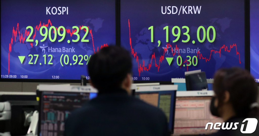 코로나19(COVID-19) 오미크론 변이 공포가 증시를 덮쳤다. 경기민감주, 리오프닝주들은 줄하락했고, 제약·바이오, 게임주가 강세를 보였다. 다만 환율은 오히려 하락하고 기관투자자가 대거 매수에 나서면서 코스피지수는 2900선을 지켰다.