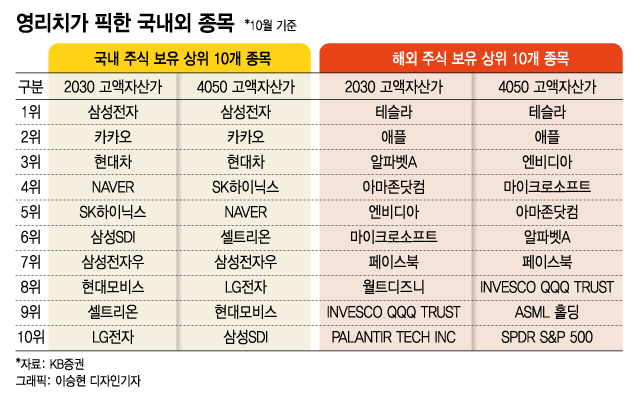 해외주식은 △테슬라 △애플 △알파벳A △아마존닷컴 △엔비디아 순으로 갖고 있었다. 영리치가 보유한 상위 10개 종목이 4050 고액자산가가 선택한 종목과 거의 유사했지만 △월트디즈니 △팔란티어 테크놀로지스는 영리치 보유 상위 종목에만 이름을 올렸다. 4050 고액자산가는 대신 △ASML 홀딩 △SPDR S&P 500을 선택했다.