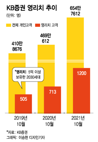 2일 KB증권에 따르면 지난 10월 기준 KB증권 고객 중 5억원 이상의 자산을 보유한 영리치 고객 수는 1200명으로 전년(713명)대비 68.3% 증가했다. 전체 개인고객 증가율(39.6%)를 크게 웃돈다. 2019년(505명)과 비교해선 137.6%나 늘었다.