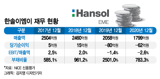 NICE신용평가에 따르면 지난해 연결기준 한솔이엠이 EBIT(이자 및 세전이익)/매출액은 -2.6%를 기록했다. 부채비율도 783.3%에 달한다.