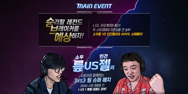 앤빌 오브 레전드는 전 프로게이머 출신 크리에이터 소우릎, 인간젤리와 함께 진행한다. 9일 개인 트위치 채널을 통해 매치를 공개하게 되며 시청자 투표와 응원 등 이벤트를 진행하게 된다.
