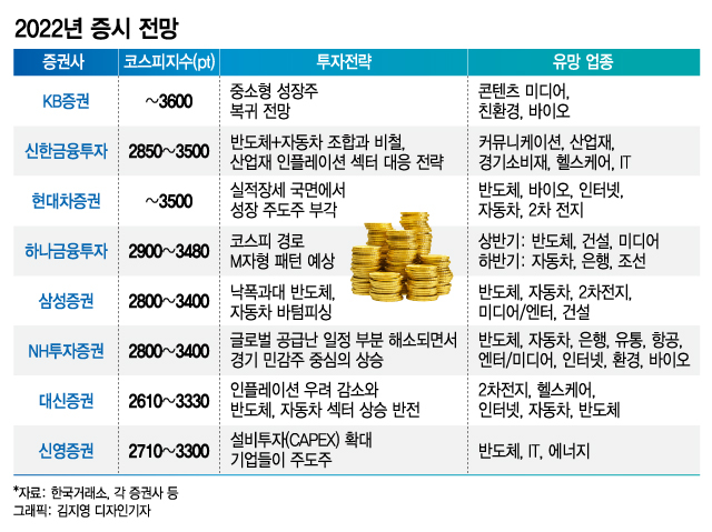 투자 유망업종으론 반도체, 2차전지, 자동차, 헬스케어 등이 꼽혔다. 대신증권은 "글로벌 공급망 병목현상 완화로 생산, 판매의 회복이 예상되는 자동차 산업, 반도체 경기 하락 사이클 조기 종료에 따른 반도체 산업 등에 관심을 가질 필요가 있다"며 "2차전지, 헬스케어, 인터넷 업종 등 구조적 성장이 담보된 산업도 투자 유망 섹터"라고 밝혔다.