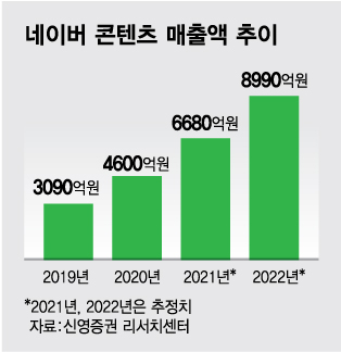 웹툰, 웹소설 등 콘텐츠를 기반으로 한 글로벌 확장도 순항 중이다. 웹툰을 영상화하는 작업도 성공했다. 메타버스 사업이 구체화되고 있고, 콘텐츠를 기반으로 한 해외 사업 확장에도 속도가 붙고 있는 만큼 네이버의 주가 상승 여력은 여전히 높다는 분석이 나온다.