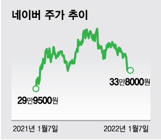 네이버의 지난 7일 종가는 33만8000원으로 올해 들어 10.7% 하락했다. 연준의 조기 통화 긴축 가능성이 높아지면서 나스닥이 급락했고, 이 여파는 네이버에도 미쳤다. 지난해 4분기 영업이익이 시장 기대치를 하회할 것이란 전망도 나오고 있다.