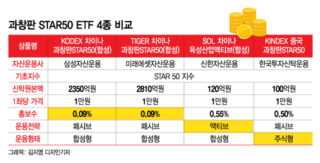 '중국판 나스닥'이라 불리는 과창판 상장지수펀드(ETF) 4종이 유가증권시장에 동시 상장했다. 이들 ETF가 모두 같은 지수를 추종하면서 상품별 차이점에 투자자의 관심이 모인다.