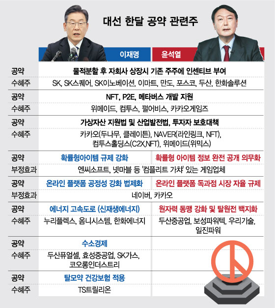 이재명·윤석열 두 후보가 공통으로 내건 공약도 있다. 둘 중 누가 되더라고 '수혜'가 예상되는 분야는 바로 가상자산(암호화폐) 관련주와 물적 분할 관련 모회사다.