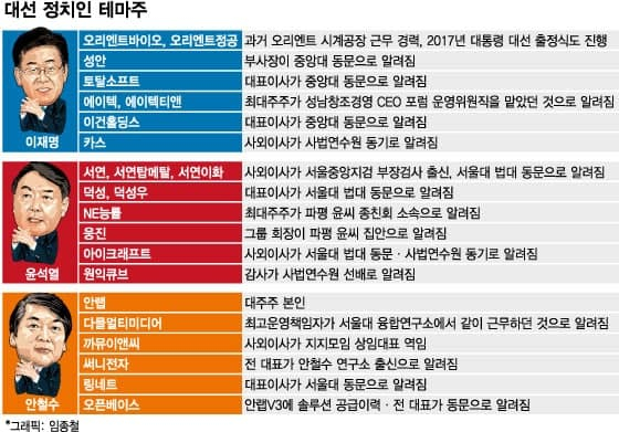 대선 테마주의 양대 산맥은 '인맥주'과 '공약주'다. 회사 오너나 대표이사(CEO)가 대선 유력주자와 동향, 학교 동문 등 연결점만 있으면 주가가 요동친다. 친소 관계는 의미없다. 오히려 '그렇다더라'는 확인할 수 없는 '설(說)'이 '인맥 테마주'에겐 보약이다.