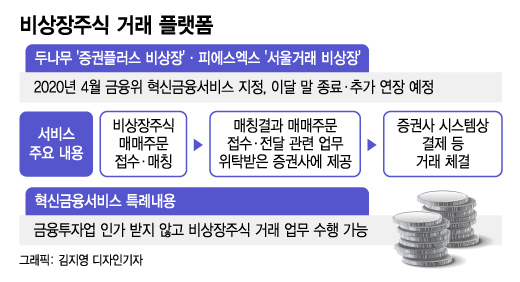 당국은 비상장 주식 거래가 활성화된만큼 서비스 중단 위기까지 몰아가지 않기로 가닥을 잡았다. 금융위가 혁신금융서비스 연장을 불허하면 이들 업체는 법 위반으로 플랫폼을 더 이상 운영할 수 없게 된다.