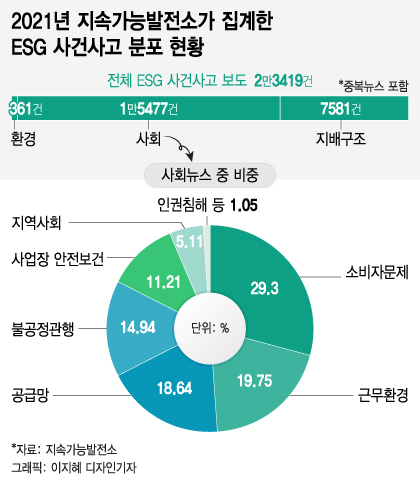 2021년 한 해 국내 기업들의 ESG 관련 사건·사고를 다룬 뉴스·보도에서 가장 많이 언급된 이슈는 '직원' '소비자' '노조' 등 사회부문과 관련한 내용인 것으로 나타났다. 과거 5년간 대표이사 등 경영진의 불법·탈법 등 지배구조 부문에서의 문제가 ESG 사건·사고 뉴스의 주류였던 것과 달라졌다는 평가다.