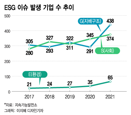 'E'(환경) 관련 사건·사고가 발생한 기업의 수는 35개에서 65개로 85.7% 늘었다. 'S'(사회) 관련 사건·사고 발생기업의 수는 345개사에서 374개사로, 'G'(지배구조) 관련 사건·사고 발생기업의 수는 291개에서 438개사로 각각 8.4%, 50.5% 증가했다.