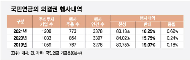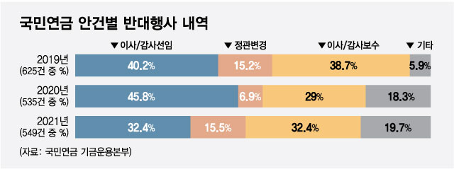 한편 지난해 한 해 국민연금은 1208개사에 투자해 이 중 773개사가 상정한 3378개 안건에서 549건(16.25%)에 반대표를 행사한 것으로 나타났다. 전체 반대안건 중 '이사·감사 선임안'의 비중은 2020년 45.8%에서 32.4%로 13.4%포인트나 줄었지만 '이사·감사 보수한도' 비중은 같은 기간 29%에서 32.4%로 3.4%포인트 늘었고 '정관변경'에 대한 반대표 비중도 6.9%에서 15.5%로 높아졌다.