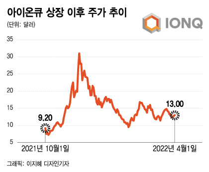 아이온큐는 지난해 10월1일, SPAC과 합병해 상장한 날 9.20달러로 마감했으나 얼마 뒤 폭등세를 타기 시작해 지난해 11월17일 31달러로 사상최고가를 기록했다. 하지만 이후 주가는 폭락세를 보여 지난 1일 종가는 13달러였다. 시가총액은 25억7000만달러이다.