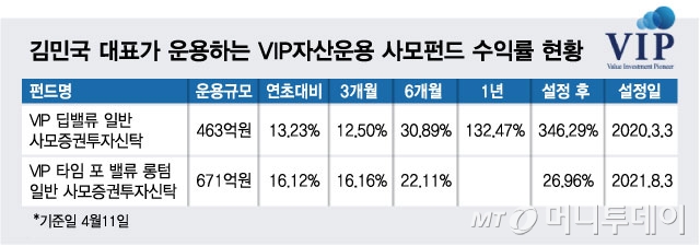 그는 딥 밸류(Deep Value) 펀드매니저다. 초저평가된 굴뚝주를 좋아한다. 지난해 VIP자산운용은 순이익 661억원 사상 최대 실적을 거뒀다. K-주식에 대한 치열한 고민은 수익률로 돌아왔다. 김 대표가 직접 운용하는 VIP 딥밸류 사모펀드는 2020년 3월 설정이래 346.29% 누적수익률을 기록했다. 최근 1년 수익률만 132.47%에 달한다.