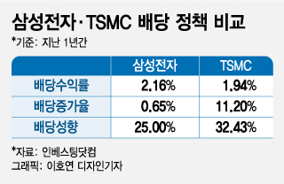 삼성전자를 말할 때면 비교 대상으로 등장하는 게 세계 최대 파운드리(반도체 위탁생산) 업체인 대만 TSMC. 기술, 투자 등의 차이를 지적하지만 주주 친화 정책에서의 엇갈린 행보 역시 무시할 수 없다는 지적이 나온다.